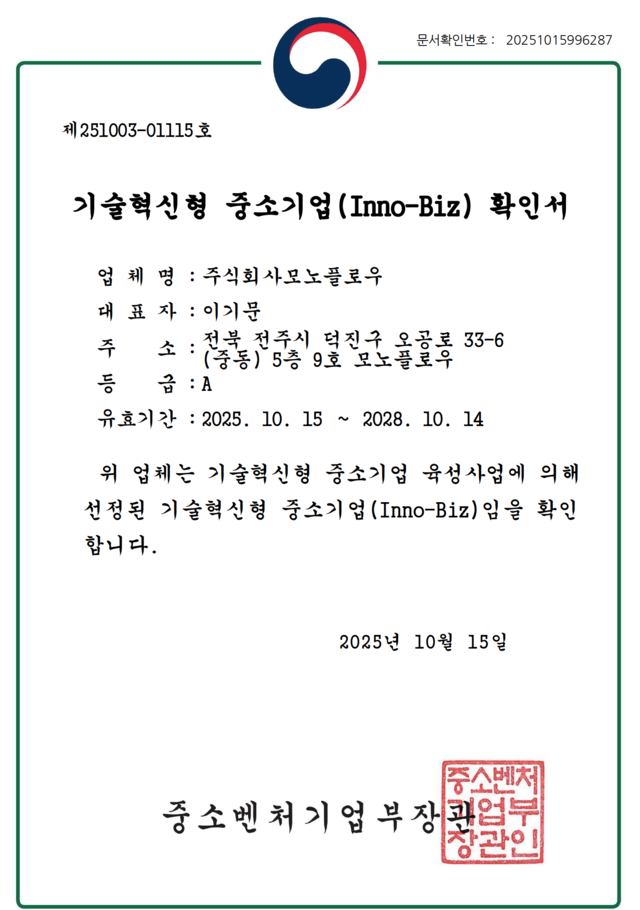 본사 전라북도 덕진구 오공로 33-6, 5층 (주)모노플로우